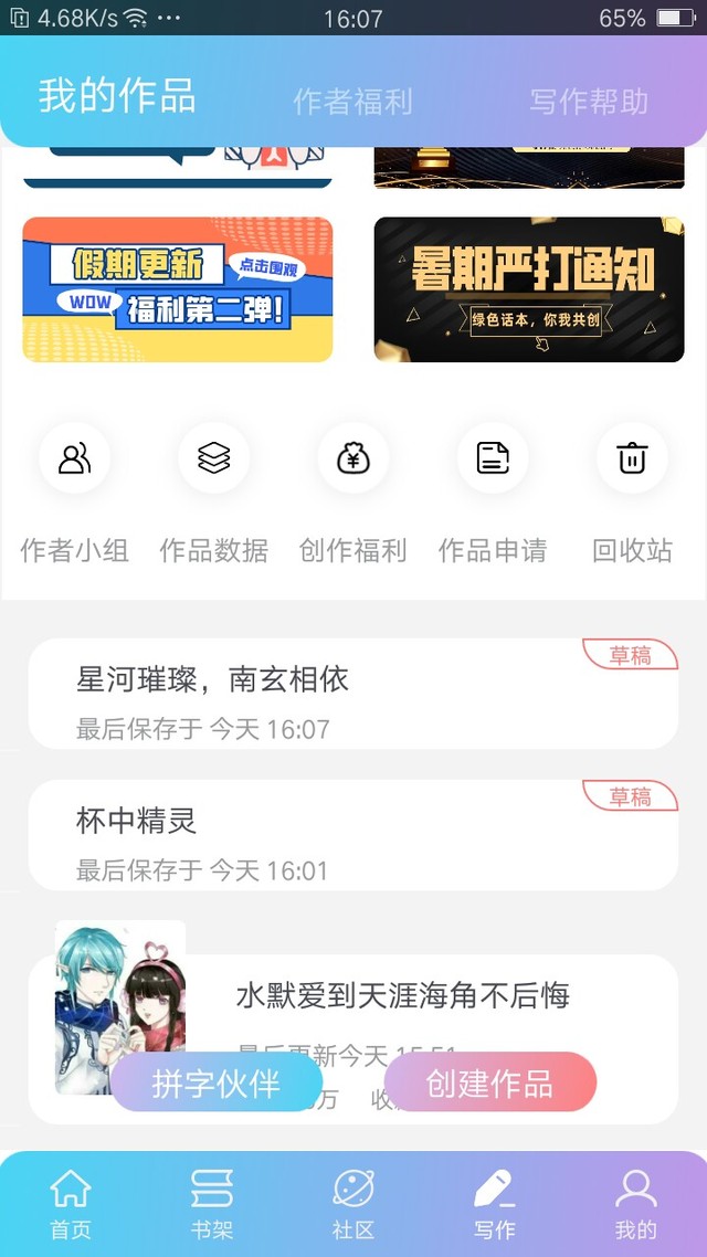 蓝眼泪星河璀璨和杯中精灵是我的两部新作品,本周六和日更,目前只是草稿打好了而已,周六日记得来看看啊!请大家多提提意见!