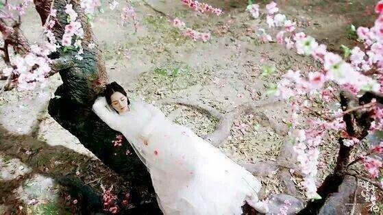 凉凉夜色,十里桃林一位大约十七八岁的妙龄少女,少女身着一袭白色繁花抹胸外披一件白色纱衣,那若如雪的肌肤透亮三千发丝散落在胸前,头上只有简单素雅的头饰,小巧高挺的鼻子,樱花般粉嫩的嘴唇,少女躺在桃花树上,整个画面犹似身在烟雾之中。