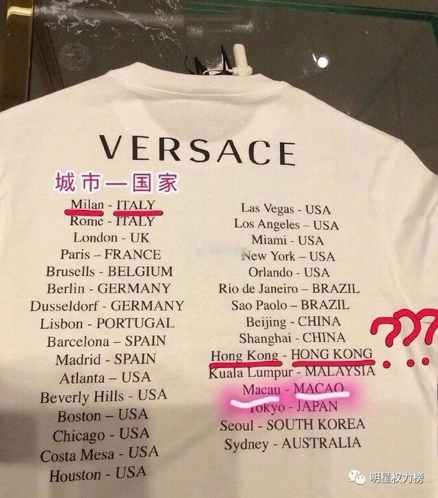 先是Versace被爆T恤背后印字把香港单独列为一个国家