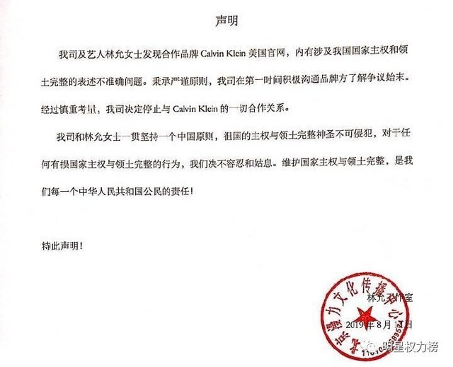 8.12号上午CK刚宣了她全新代言人的身份,但是!因为CK官网在country那里,有香港在里面,我们的林允小姐姐才隔了一天,她就上午删代言照片,下午一纸声明宣布解约了↓