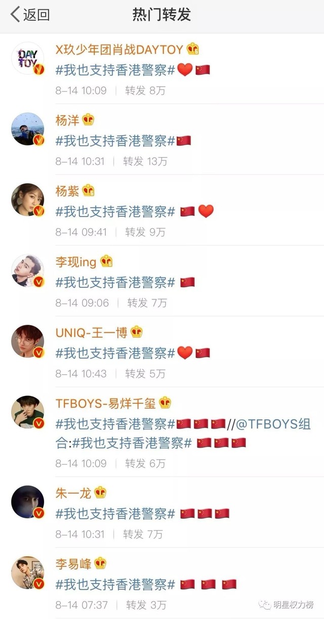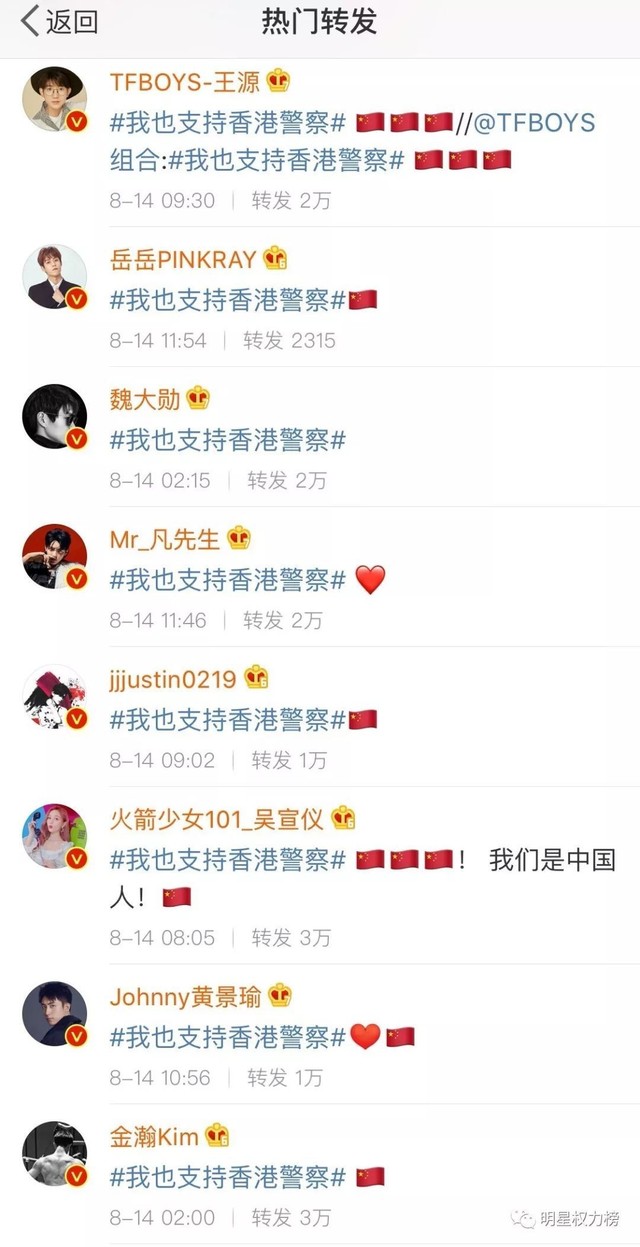 很多艺人也表示支持香港警察