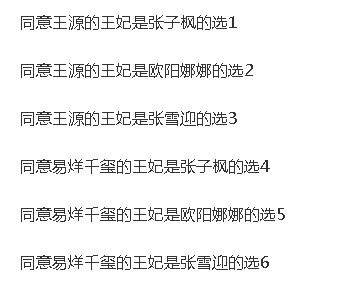 浅若清风(作者大大)投票时间已经过去一半,这次投票比我想象中的进行的顺利一些那么,到目前为止投1的有12人,投2的有22人,投3的有4人,投4的有2人,投5的有2人,投6的有26人(结合下面的图看),从这次投票来看大家心中的源王妃是欧阳娜娜,玺王妃是张雪迎。好了,话不多说希望大家赶紧投票,大大开始更文啦!