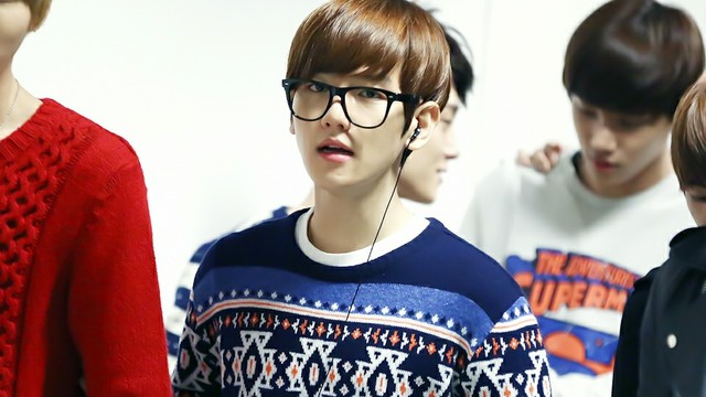 边伯贤带着黑框眼镜,穿着毛衣站在不远处。