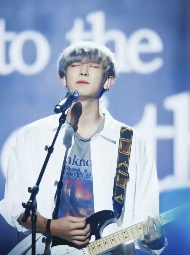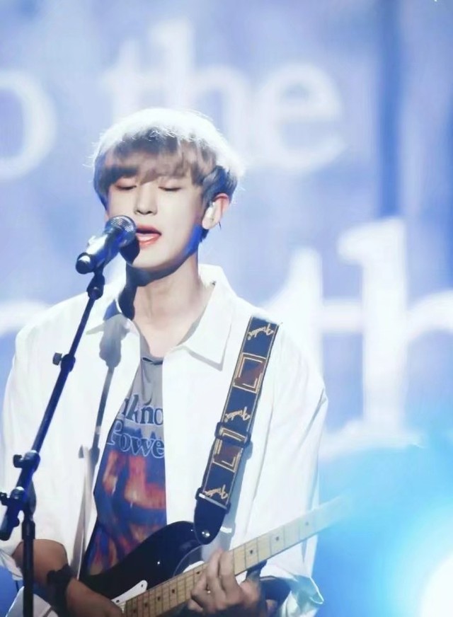 台上的朴灿烈边弹边唱