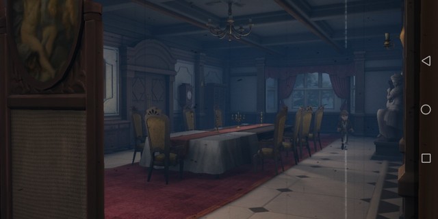 大厅的中间是一个餐桌,餐桌后面是一个雕像,雕像和餐桌被楼梯包围