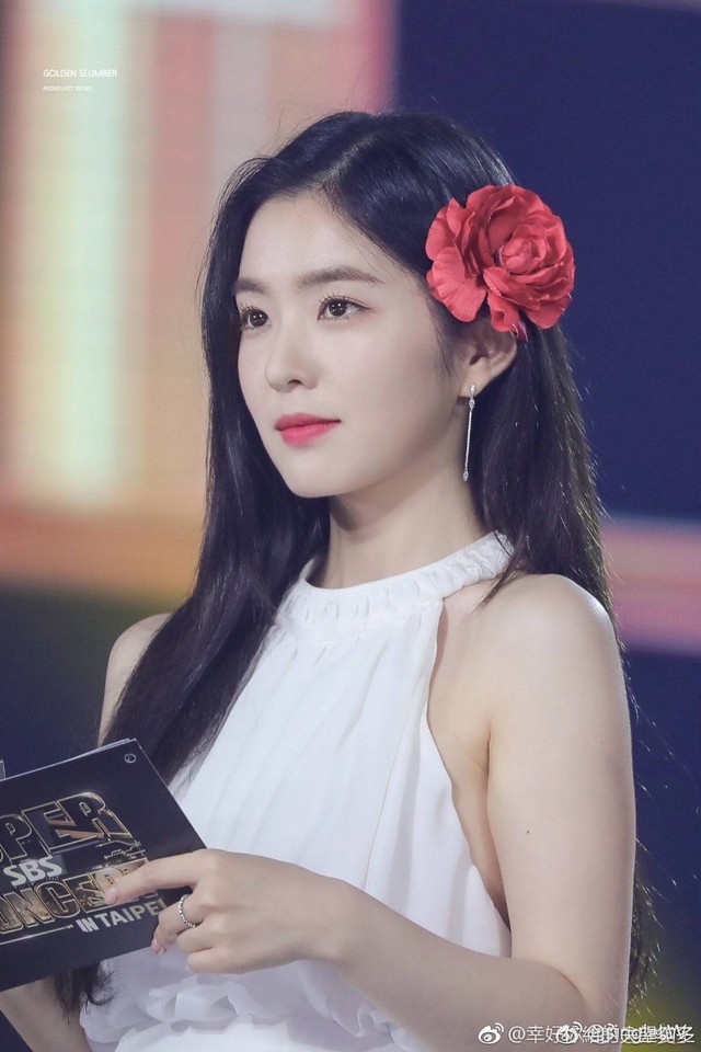你身穿露背白裙,耳边别着一朵红花,真的是人比花娇。