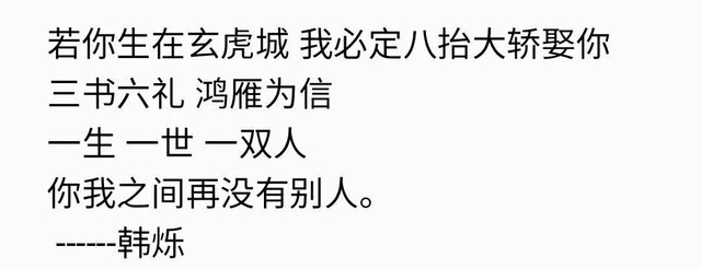 韩烁“等你母亲同意,我便带你回玄虎。八抬大轿,三书六礼,鸿雁为信,娶你过门。给你一生一世一双人,翩翩,我韩烁此生,定不负你...”
