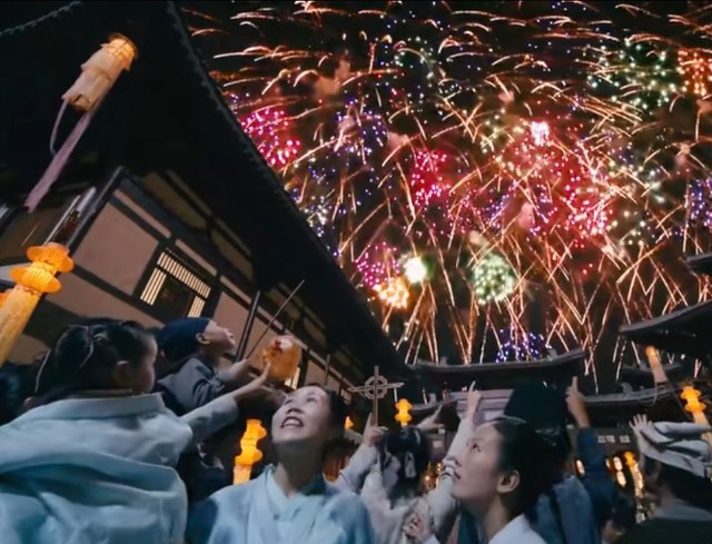 引线被点燃,瞬间呼啦啦的烟花炸开在天空,满满一片五光十色煞是好看。