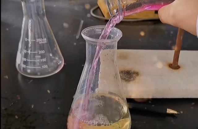 这个就是盐酸和氯化铵混合酸的测定实验,加甲醛,酚酞和甲基红指示剂,用氢氧化钠滴定随着PH增大会变色:红→橙→黄→微橙色。