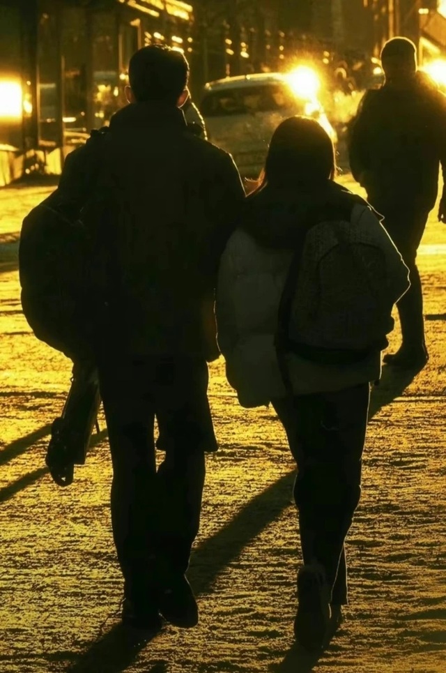 雪又开始下了,路灯把两人的影子拉得很长。