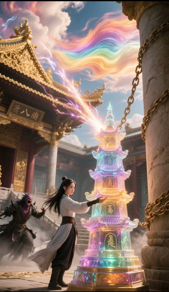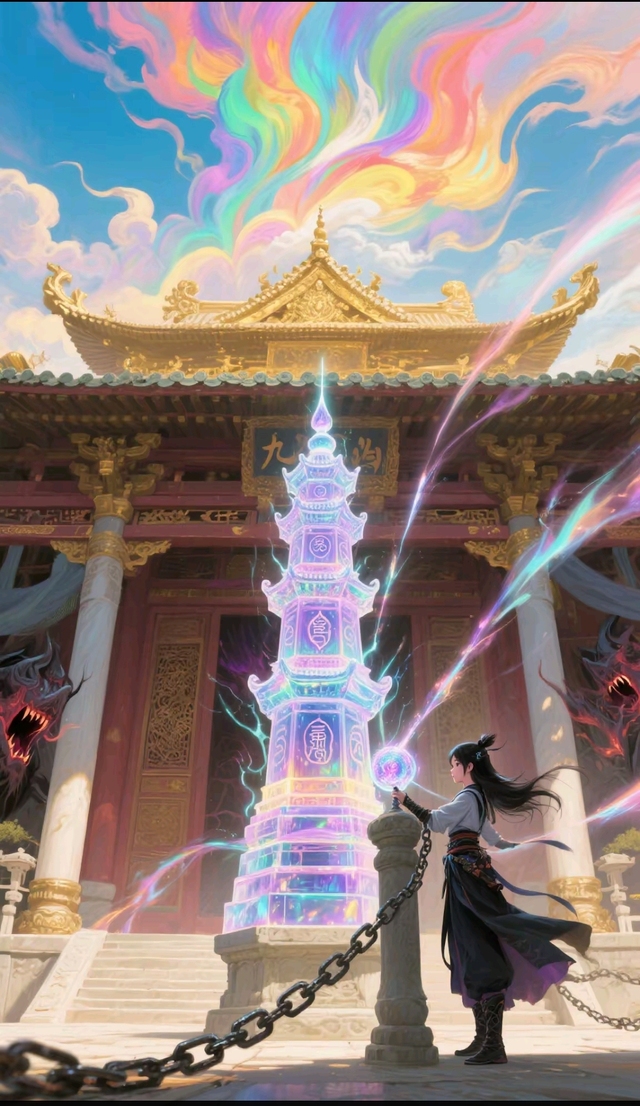 灵风卷着七彩云霞掠过九霄天宫的鎏金宫阙,冷小七手持流光溢彩的九霄琉璃塔,塔身隐隐传出百万魔修不甘的嘶吼。琉璃塔周身符文闪烁,一道道锁链状的光芒从塔身中射出,将塔内魔修的力量牢牢压制。回来正殿,小七将九霄琉璃塔暂时立足于九霄天宫石柱旁边。