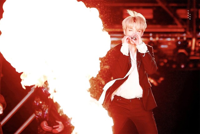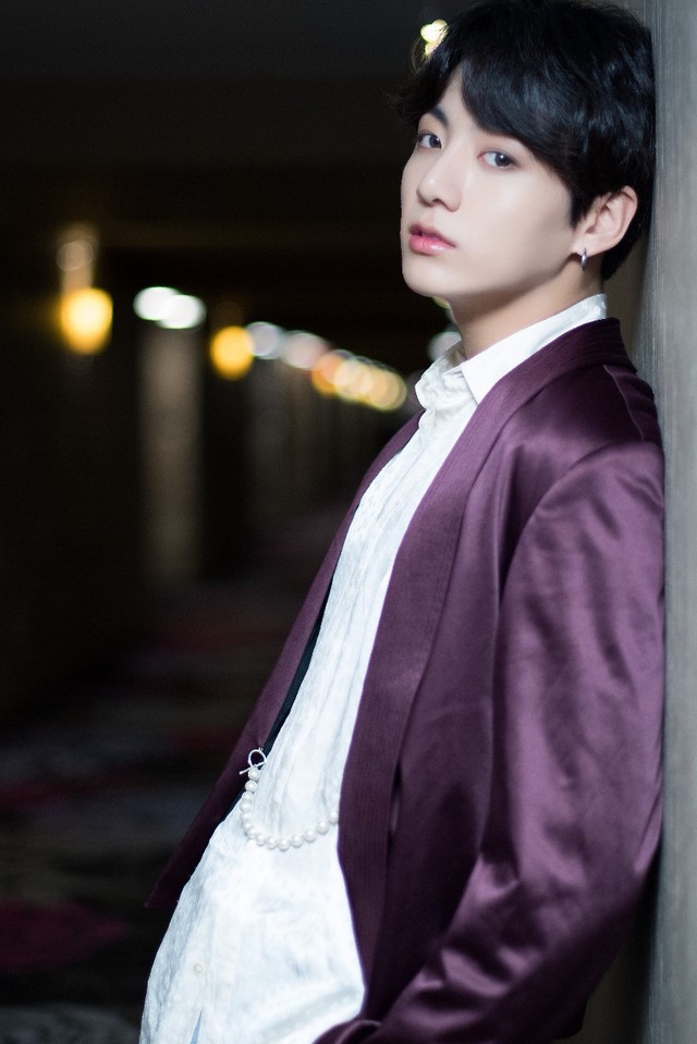 和平日里和你约会的田柾国,在JK的田柾国都不一样。穿着深紫色的西装,耳垂处挂着好几个耳环,头发被微微卷过偏分着,靠在离你不远处的走廊墙壁上,斜眼看着你。和第一次在晚会上看见的那样,淡漠疏离,而又多了一份陌生的锋利感。
