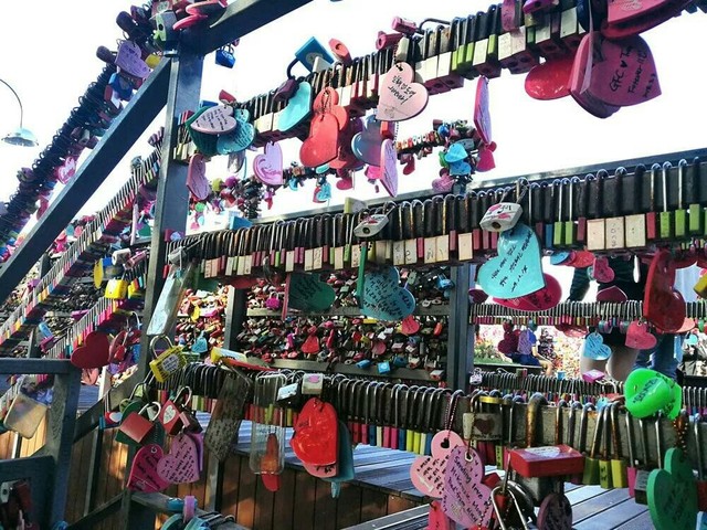 映入眼帘的是很多的同心锁,各式各样、不同颜色的同心锁,挂在栏杆边,树上,梯台上。白千羽兴冲冲的走上前去查看,栏杆旁还有卖同心锁的小贩。