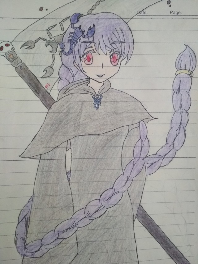 黑森林中,一个女孩走在一条小路上,女孩穿着一身黑色的带有巨大帽子的斗篷大衣,虽说是大衣但布料用的也只是简单的一层布,不过好在斗篷还算干净整洁。她走着,手中还握着一把两米高的大镰刀,带上帽子,活像一位死神。