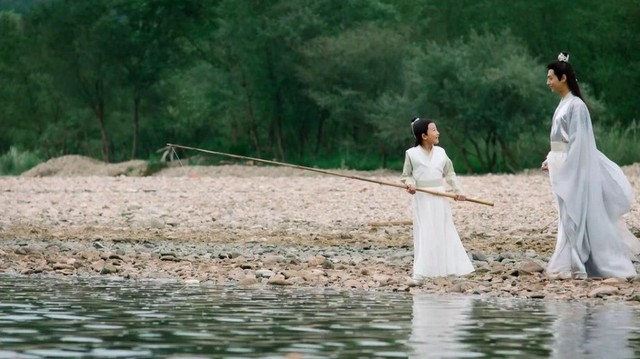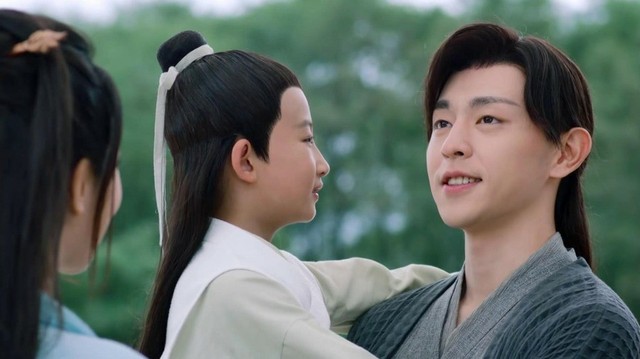 河畔拿着鱼竿的小孩子名棠越,是旭凤与锦觅的儿子,当年锦觅与旭凤听从了夙玥的意见,将魔界交给鎏英,双双归隐凡间