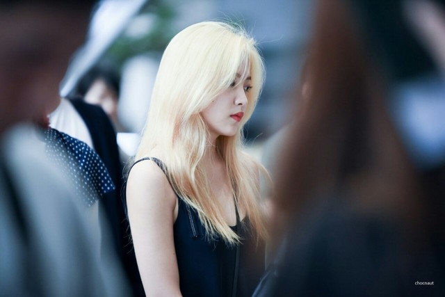 一个20岁左右的女孩穿着一个黑色吊带,一头金色的披肩长发十分耀眼