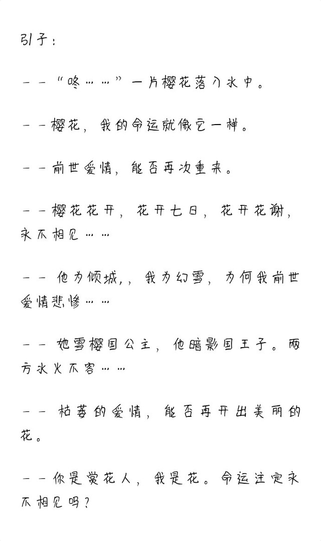 作者大大话说在这六界之中有个神奇的种族,她们以杀人为乐,制作傀儡为爱好,而且这个种族实力还强大的可怕,据说连玉帝老头也束手无策,只好联合六界一起镇压。 "嗯,这次的傀儡还不错嘛"在一座古朴的庭院中一个红衣小女孩正对着一名白发男子傻笑。 这白发男子双目无神,一动也不动,身上被无数的丝线拉扯着。 那女孩紧握的手缓缓松开,啪!那白发男子便瘫倒在地。"哎,起来"咔咔声作响,那男子再次站起。"送我回去"小女孩再次命令道,白发男子将女孩抱起,便腾空而起回了女孩的家…… 以后这些年,男孩形影不离的跟着女孩,经过一次次战场,一次次浩劫。这些年,这个种族逐渐衰弱。 10年后,女孩已经变成了一个绝世小美女。这一天,女孩伪装成一个普通人去逛街,而白发男子依旧如平常一样陪在她身边。女孩每买到一件得意的好东西便会向白衣男子傻笑一下。而男子也是微笑着抚摸女孩的头。女孩很惊奇,这个冰块难道有神智了。她感觉自己有点离不开他了。 20年后,女孩早已成为了国色天香的美女,但她的种族也面临着灭亡的危机。轰轰轰!法术爆炸声作响,不断的有人死亡。突然,一道金色的利剑向着女孩飞去,直冲她的心脏,而她又在与其为女孩它人战斗无法躲闪。千钧一发之际,白发男子突然抱住了女孩向后一推,成功的抵挡了一次强烈的法术轰击和一次致命的偷袭。但他也身陨当场。血喷洒在女孩的脸上,她很迷茫,她感觉自己丢失了什么东西,心无比的痛,当他看到白发男子时,她知道了,她的……失去了。女孩连忙跑过去抱住白发男子不停的呼唤"冰块,冰块,你怎么了!"白发男子只是用手轻抚着女孩脸颊抹去她眼角上的泪水温声说道"我没事,别哭了,要不一会美了"男孩看了看女孩身后的敌人说道"哎,就让我保护你最后一次吧,我的公主或,我的爱人。"话罢,男孩便化作数万把飞剑将敌人尽数斩杀。男孩也再也没有复活的机会了,尸体也没了。女孩坐在地上嚎啕大哭,那一夜女孩消失了,像如人间蒸发一般。有人说她自杀了,可没尸体。有人说她隐居山林了,可没见过。谁也不知道她如何了……(ฅ>ω<*ฅ)完