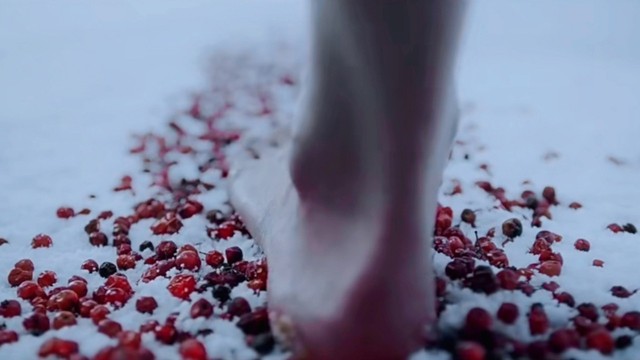 白皙的双脚踩着满是樱桃的路上。