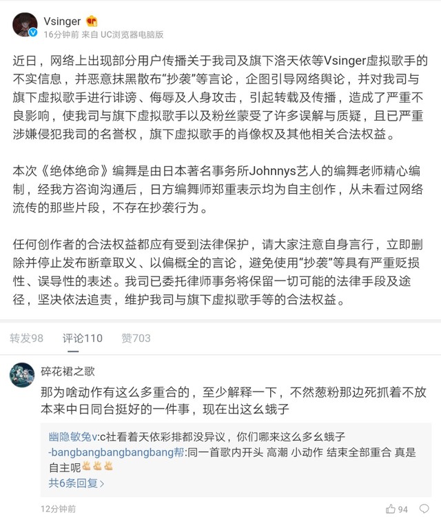 泠草嘛也……关于天依bml上的编舞有没有抄袭这件事好像越闹越大了……老V本人发微博澄清,但是评论基本是两面派,一面就是问为什么动作重合这么多,希望老V能拿出证据证明是真的没有抄袭,口说无凭,顺便还让拿出天依《追光使者》的对比图,证明没有抄袭miku的《深海少女》;另一面就是继续支持禾念,支持Vsinger。我自己都觉得混乱,我也不知道我是哪一派……我就是个吃瓜的……😂