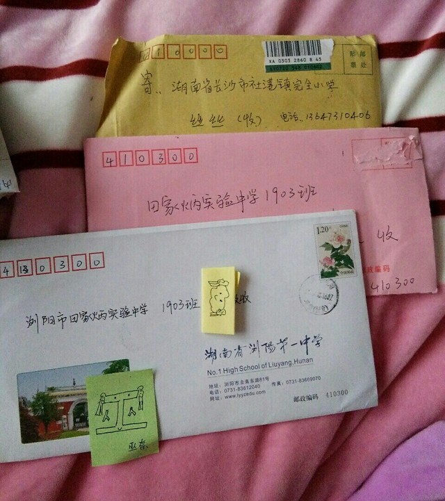 丝瓜如果按图上寄我学校来的话,收信人填WNY,俺名字缩写,三个地址的邮政编码都按图上给的填就可(注:寄信必须要邮票,图上第一封贴在了背面,第二封的邮票被集邮的同学买走了x)