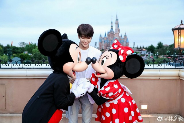 她将林彦俊从包围中解救了出来,伸手拉住了米老鼠的手,脸上带着甜甜的笑容,催促林彦俊帮她拍照。