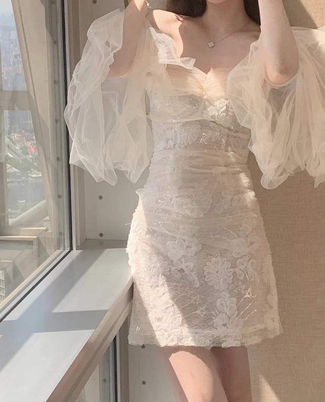 穿上一袭白色蕾丝抹胸连衣裙,连衣裙直到大腿那里,显出她的腰身以及她的美腿,袖子上的两层纱环绕在她的手臂上,仙气十足