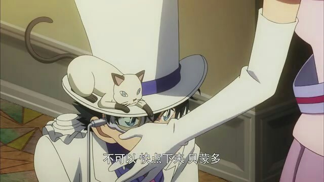 一只小猫跳到了基德的帽子