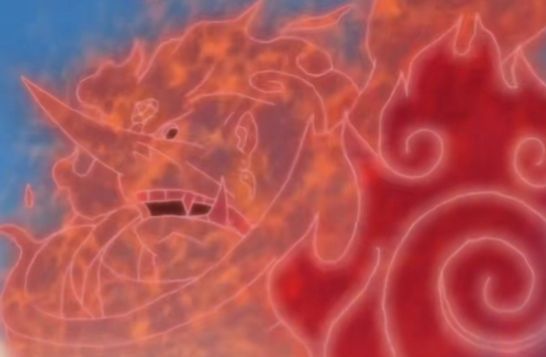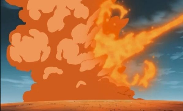 佐助飞上天空,往地上吐出豪龙火之术。