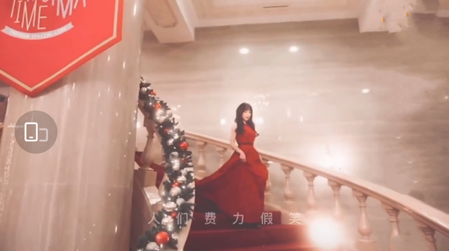 随着奏乐声悠扬响起,一个浓妆淡抹的艳丽女人慢慢从螺旋楼梯上方显露出身姿。她手挽一名身着黑色燕尾服的中年男人款款而下,红裙飘飘,笑意盈盈,仪态端庄优雅。