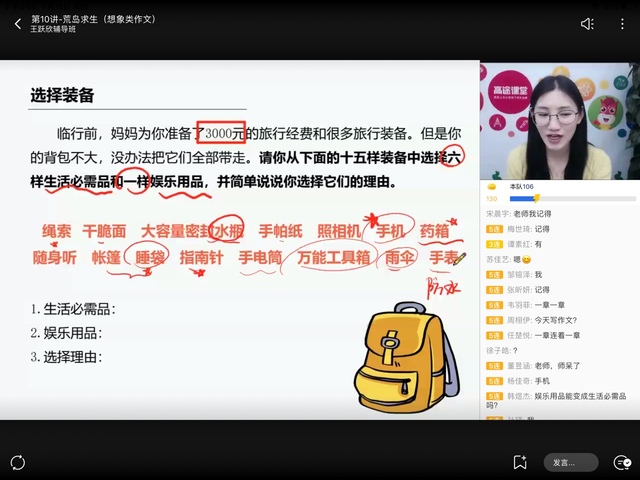 美智子绳索,干脆面,大容量密封水瓶,药箱,指南针,睡袋