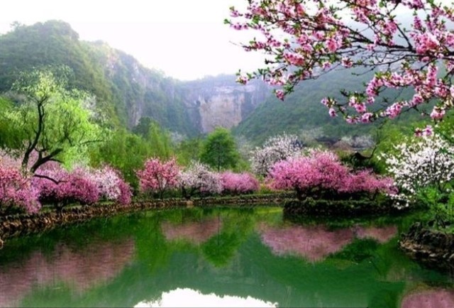 穿入门坊,便进入“忽逢桃花林,夹岸数百步,中无杂树,芳草鲜美,落英缤纷”的桃花林。这里桃林密茂,每当春暖花开之时,桃花如火,花树枝头,浓淡相间,有鲜红如碧血,有的艳丽如胭脂,千树万树,织就花的云锦。再现了陶令笔下的意境,耐人寻味。