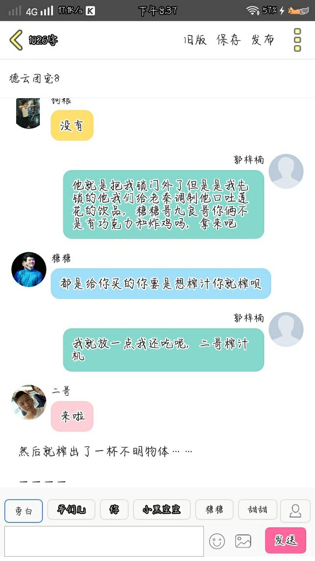 糖糖大楠你一会儿要不攒个底九熙九华请假了,你和王鹤宇(前方高能注意我们要砸卦了,让wyz攒底是因为好砸卦,还有这个时候wyz发了那个视频但是事情还没那么大纯属是好砸卦,七队的人基本上都看见了还没来得及跟栾怼怼说)