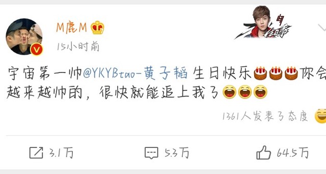 都暻秀—EXO:韬生日快乐,晚上会看你和鹿哥的节目的
