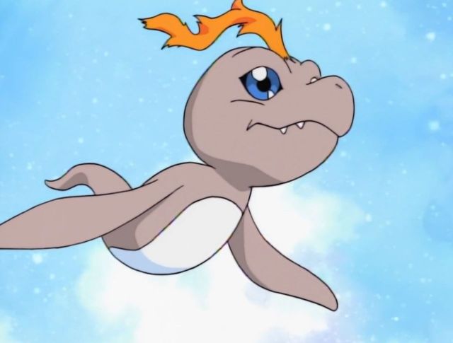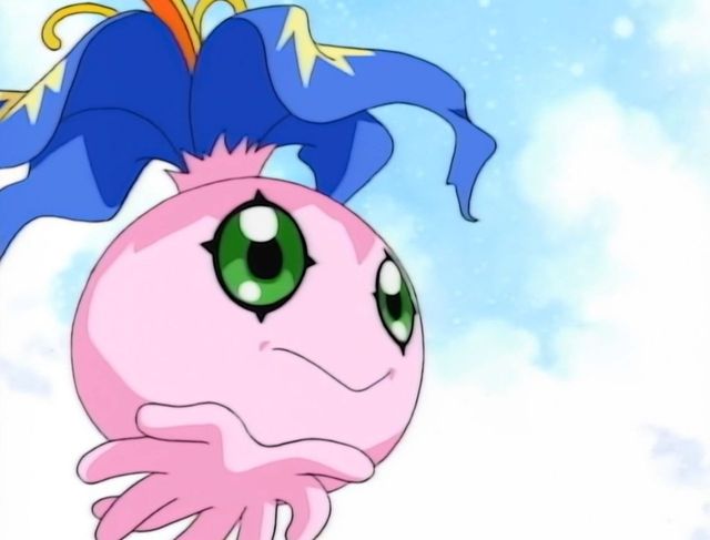 年糕兽在光子郎的手上扭动着自己的身体,想要挣脱。