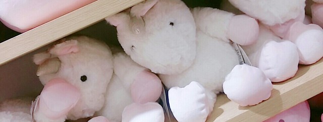 这一排货架上坐着一个又一个粉红可爱的小独角兽。