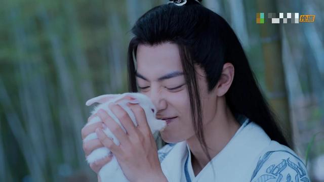 之后魏无羡在一片竹林中怀抱一只小兔子。