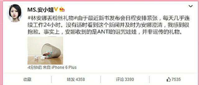 “#林安娜丢粉丝礼物事件#由于最近新书发布会日程紧张,每天几乎连续工作24小时。没有适时看到这个新闻及时为安娜澄清,我感到很抱歉。事实上,安娜收到的是ANTI的诅咒娃娃,并非谣传的礼物。