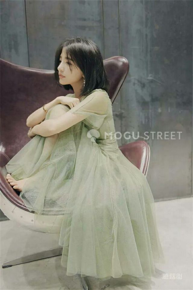 身着Mikesaiti品牌的一袭绿色长裙