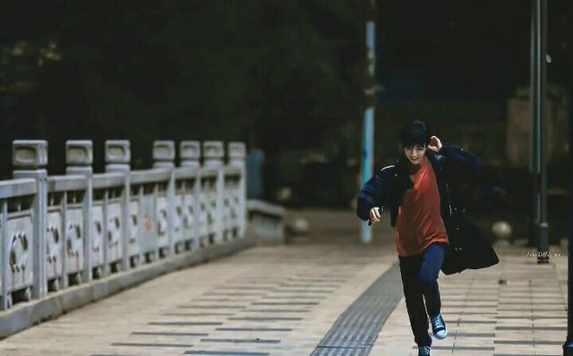 她看到王俊凯已经脱掉了他刚才身上套着的白色羽绒服,而是换上了她刚刚揣在怀里的衣服,站在江边的桥上。