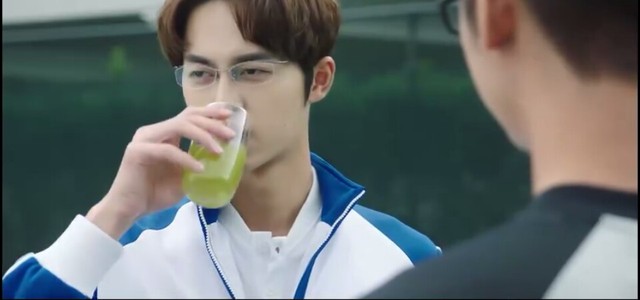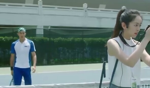 钱世民(严智明)下一个是你,(递给他网球拍。看着他一脸嫌弃果汁的表情)别怕!