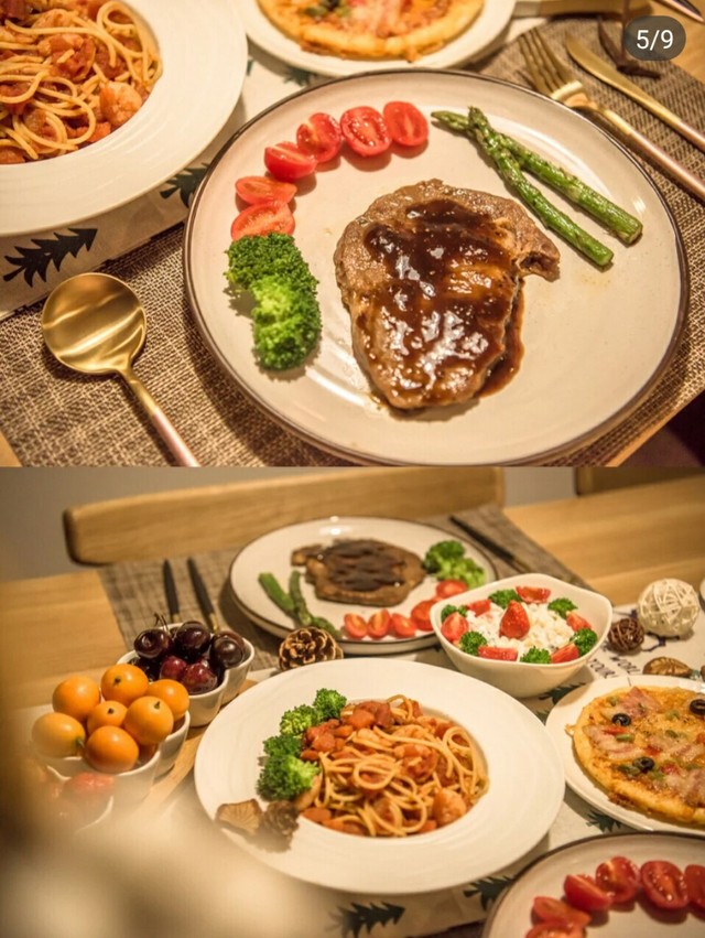 Justin我煎好牛排了,意面我来吧,你去做沙拉和摆盘