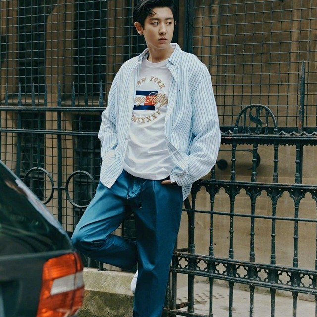 后准穿了一件白体恤,外边一件蓝白条纹外套。下边一条深蓝色阔裤,一双小白鞋。靠在围栏上,十分帅气。