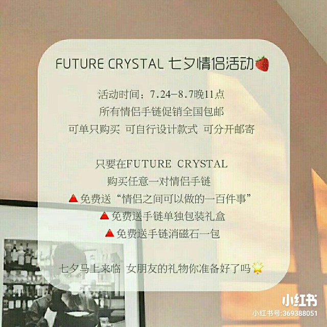 作者大大这是FutureCrystal工作室的线下代理 我们的主打产品:水晶饰品 副业:各种大牌1:1精仿 我们的水晶都是具有国家鉴定书的,不可能有假 水晶是稀有矿物,宝石的一种 水晶也可以指无色透明的二氧化硅结晶,属贵重矿石。时下与冰彩玉髓,碧玺等并列纳入彩色宝石范畴,产量较少。古称“水玉”、“水精”。 我的水晶都是经过严格要求,每一款水晶,都是我们整个团队日日夜夜讨论出来的,只为了给客户一个好的产品,好的印象 我欢迎每一位来购买水晶的朋友,愿我们的水晶能给你们带来好运。每一种水晶都有不一样的作用,可以咨询我,也可以翻看我的朋友圈下单,我们接受客户在线预订,您说出您的要求,我们帮您设计属于您的独一无二的水晶手链|项链。 店长不高冷,好相处 随时在线回复消息