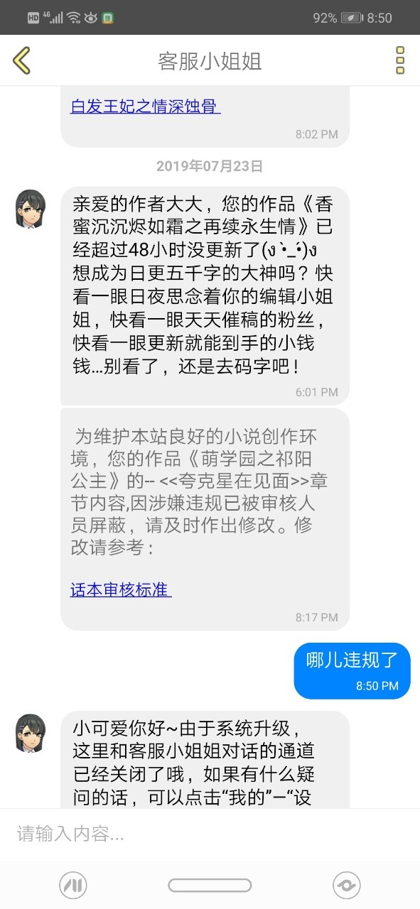 作者就连我的那本白发王妃之情深蚀骨———启宇两国相结盟,事情原委终捋清都被屏蔽了一次,我真的不知道哪儿违规了,整的都没心思写了