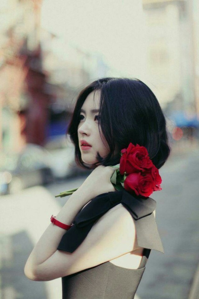 尹善英穿着黑色裙子手中拿着玫瑰花。
