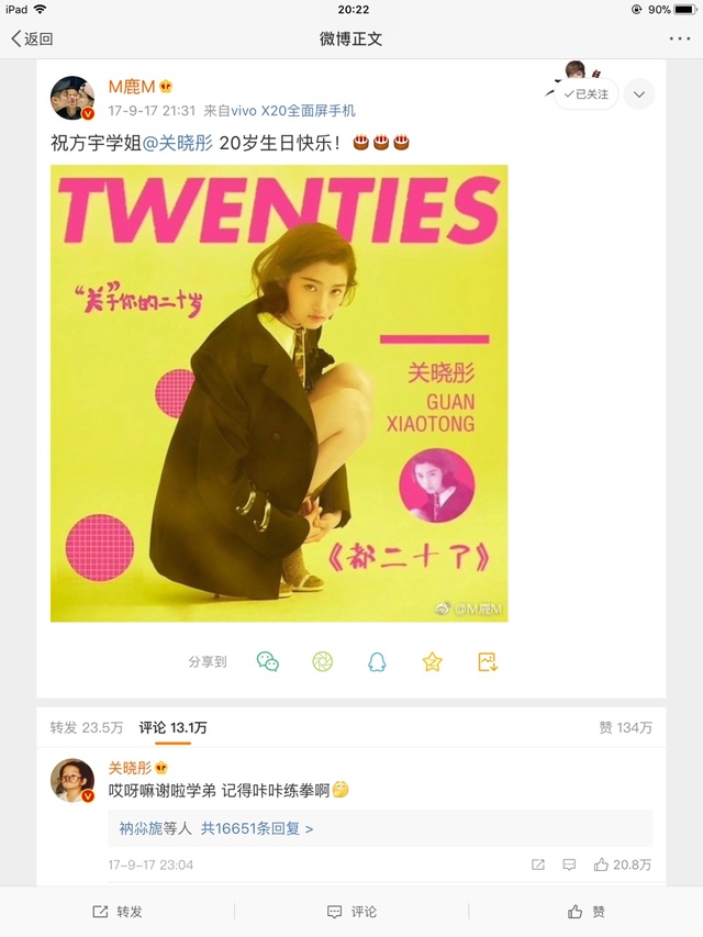 鹿晗瞒着关晓彤发了个微博送祝福,顺带宣传了关晓彤的新歌《都二十了》。关晓彤回复的,也暗含鹿晗的口头禅