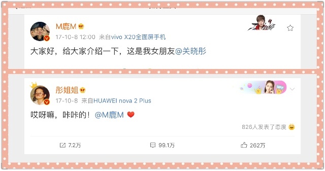 关晓彤同样发了个微博回复:“哎呀嘛,咔咔的!@M鹿M♥”