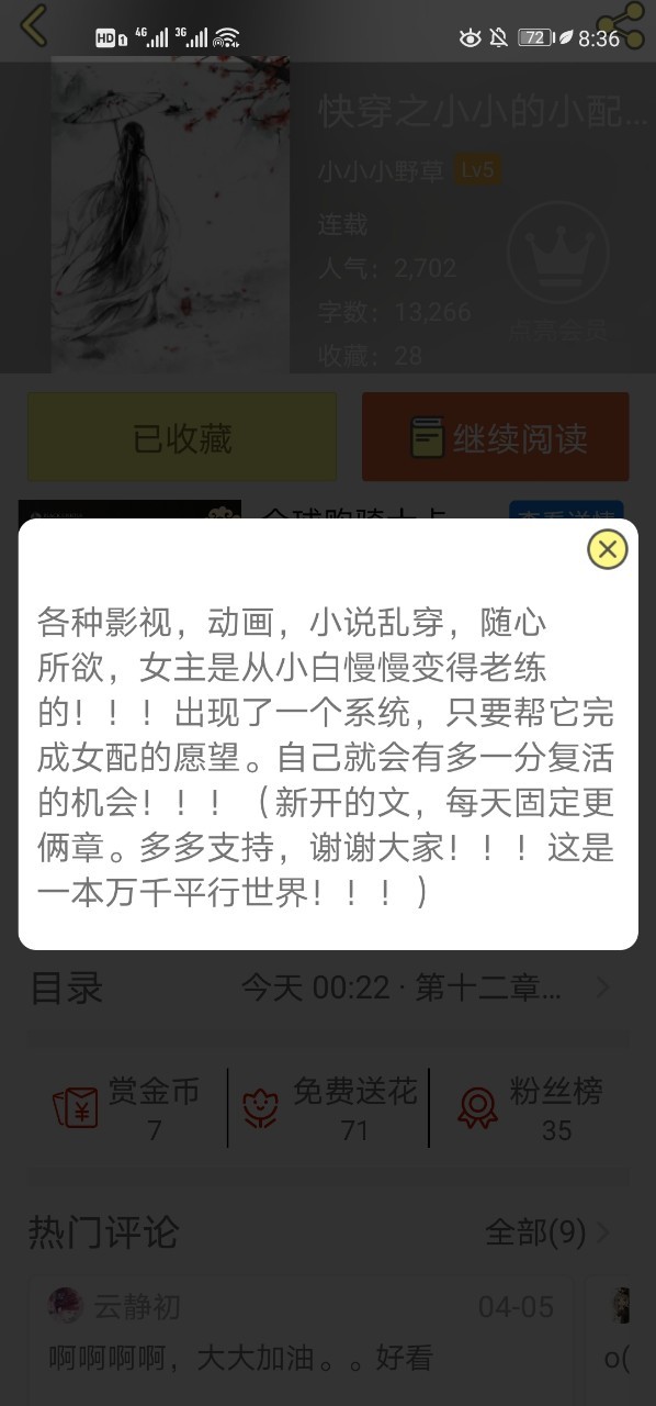 是一本各种影视快穿的文,帮助影视剧小配角实现她们的愿望。第一个故事《锦衣之下》里是陆绎的未婚妻。第二个故事《皇帝陛下》里黑化王爷的小婢女。第三个故事《陈情令》被薛洋欺负的阿箐………其他还在构思当中……