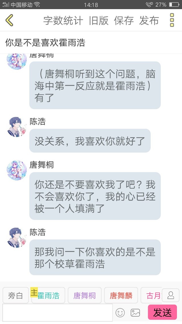 霍雨浩【唐舞桐,你居然不喜欢我啊!亏我还喜欢你,上次跟我说的我惹到她了,到底是怎么回事啊!难道只是为了摆脱我?找男朋友吗】