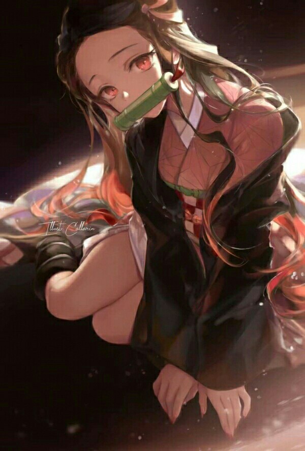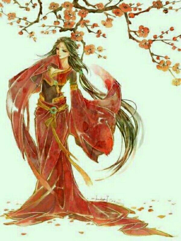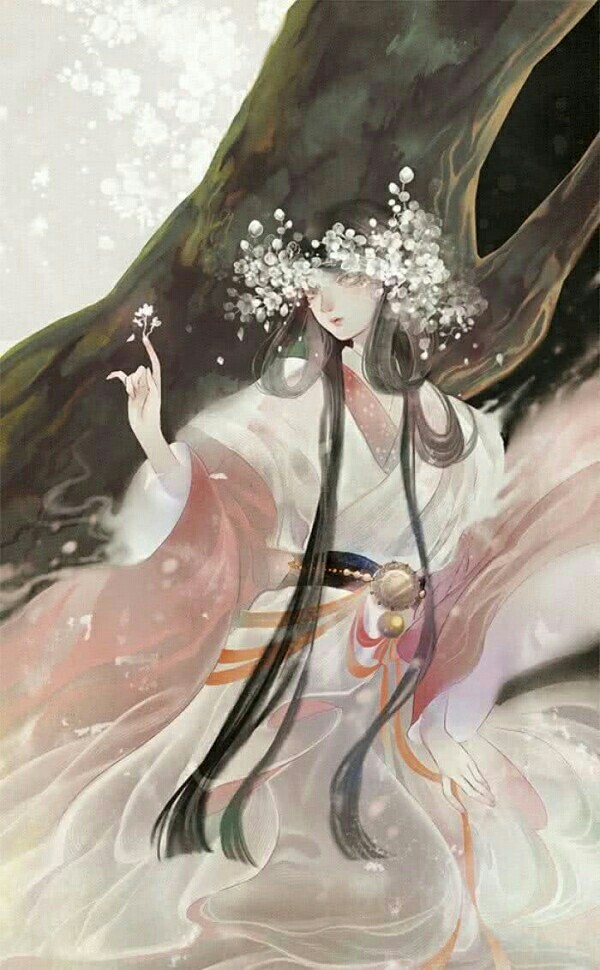 长大后绑着杏色的双马尾,用两个红色山茶花装饰着双马尾。